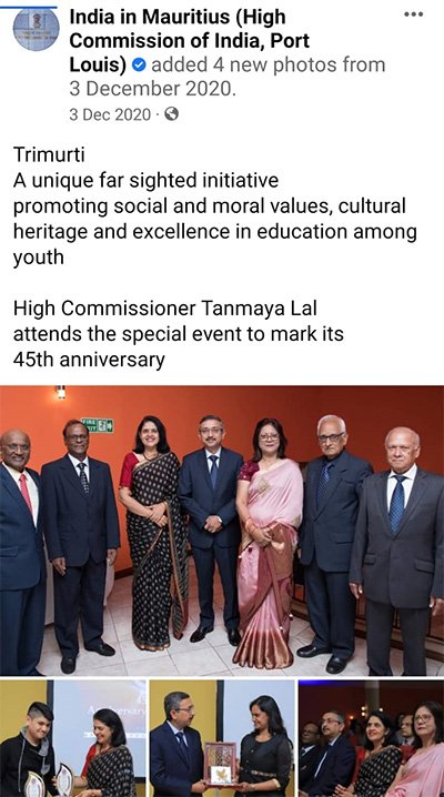 On the 3rd of December 2020, The Indian High Commissioner after attending the special event to mark the 45th anniversary of Trimurti described Trimurti, in the website of the Indian High Commission, as "A unique far sighted initiative promoting social and moral values, cultural heritage and excellence in education among Youth".
